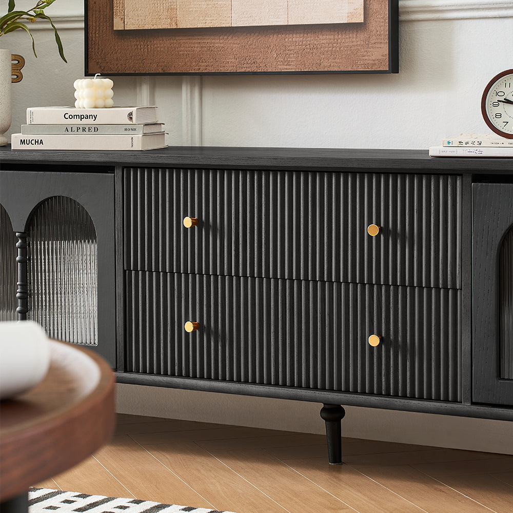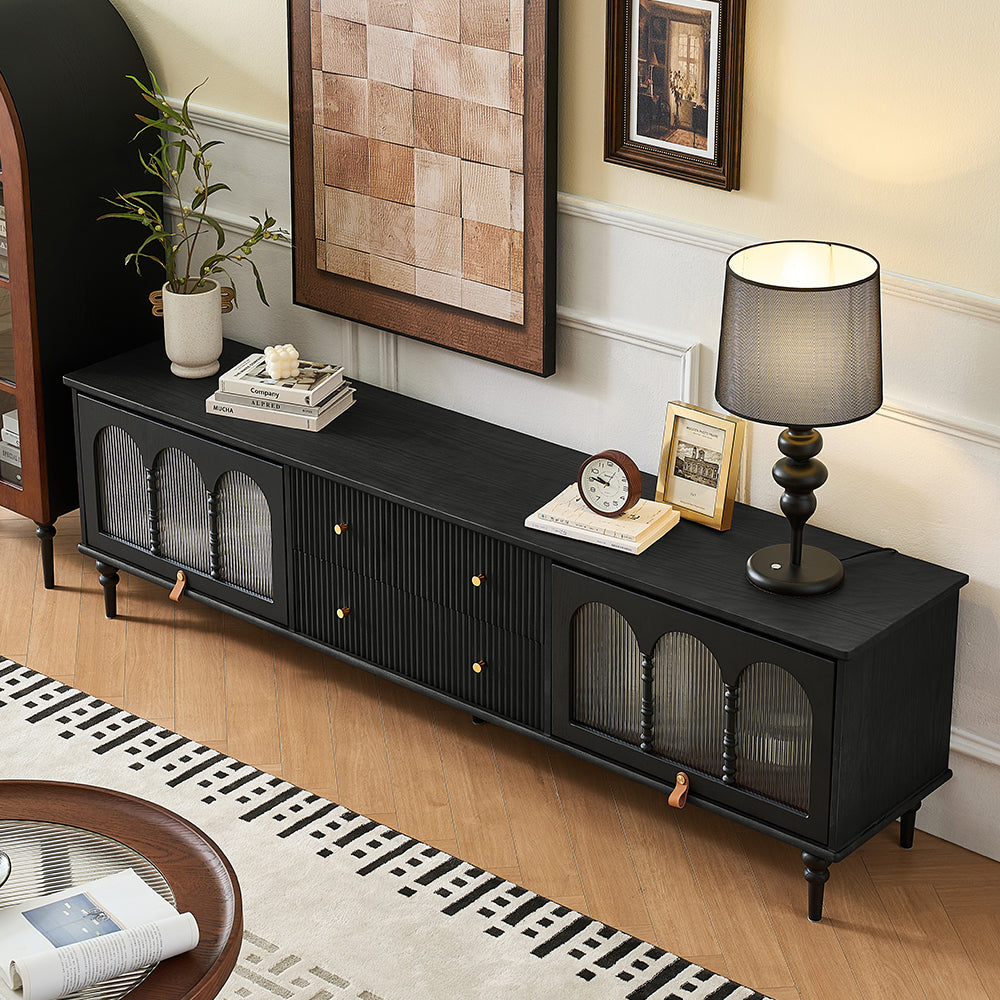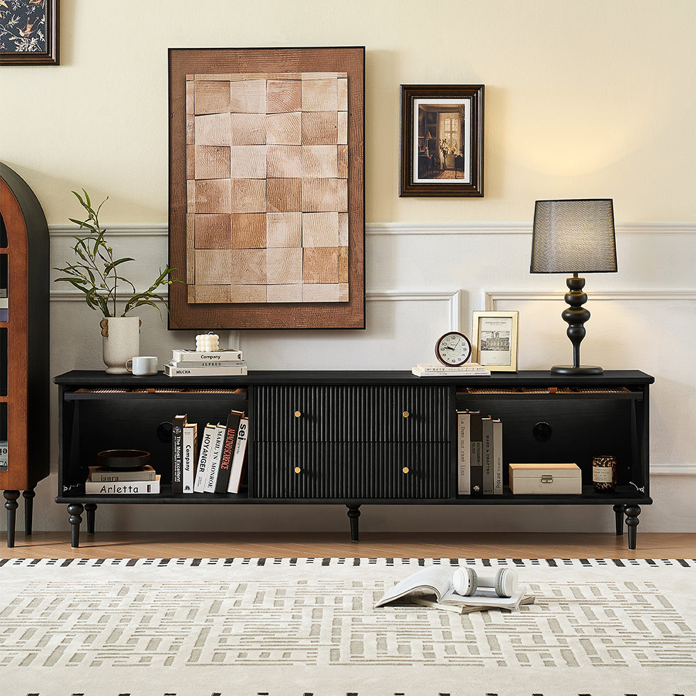 This Bined 70" Media Console features fluted design drawers and turning legs, adding a refined mid-century modern touch to your decor.