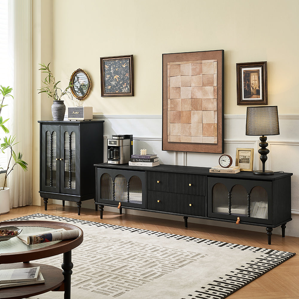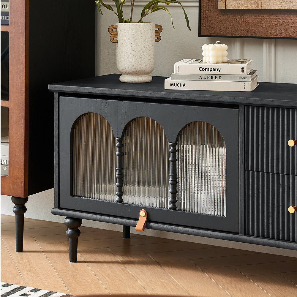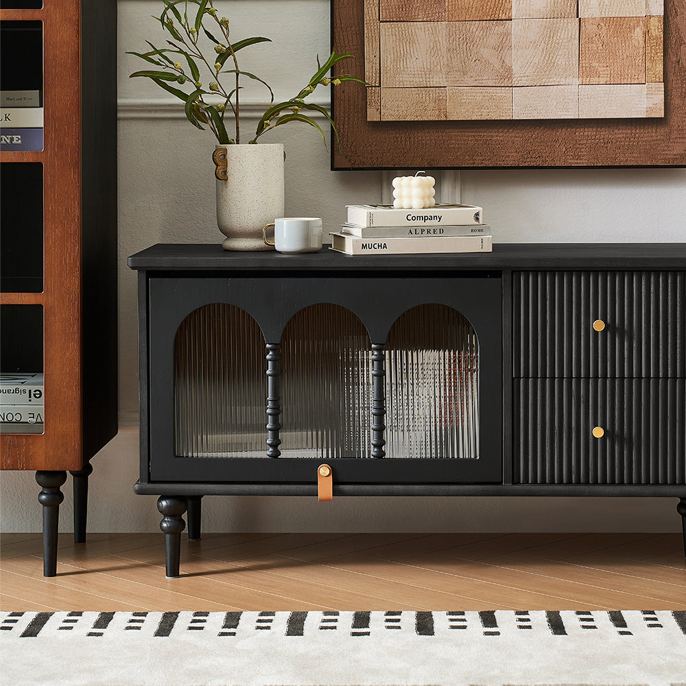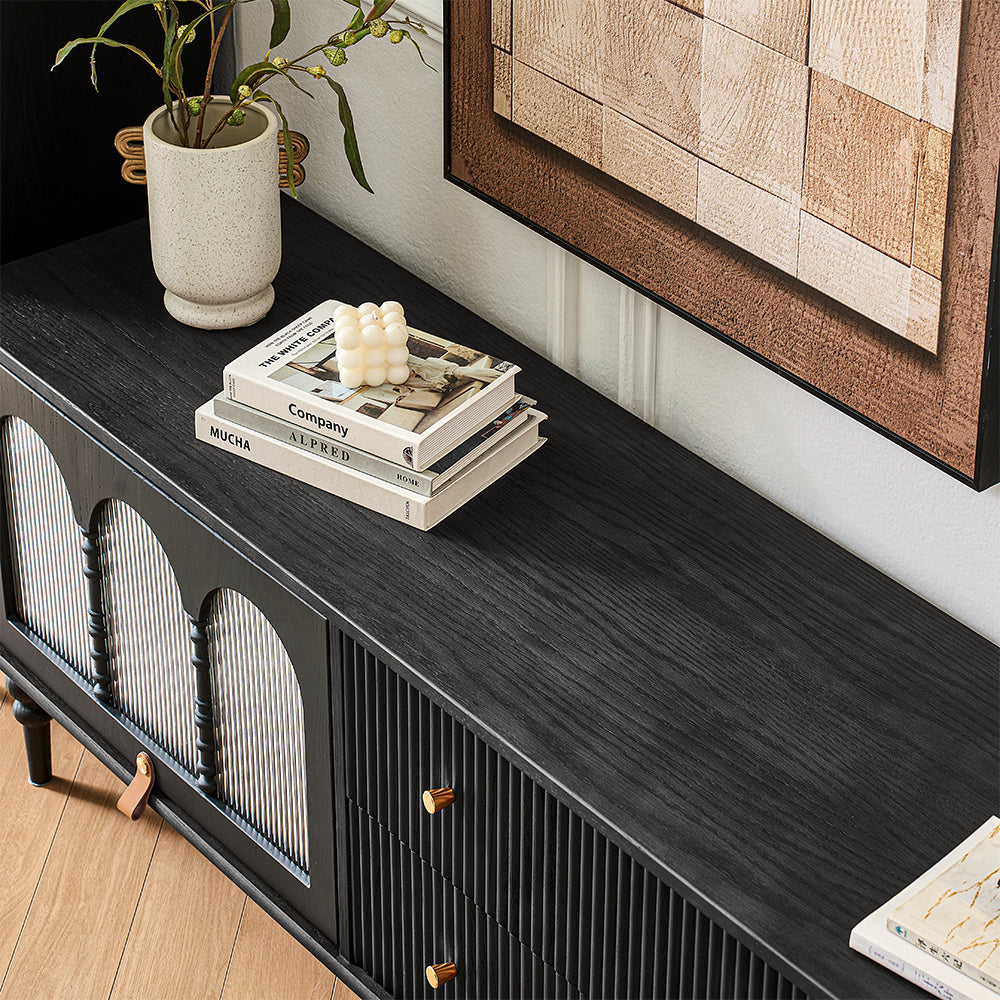 This Bined 70" Media Console features fluted design drawers and turning legs, adding a refined mid-century modern touch to your decor.