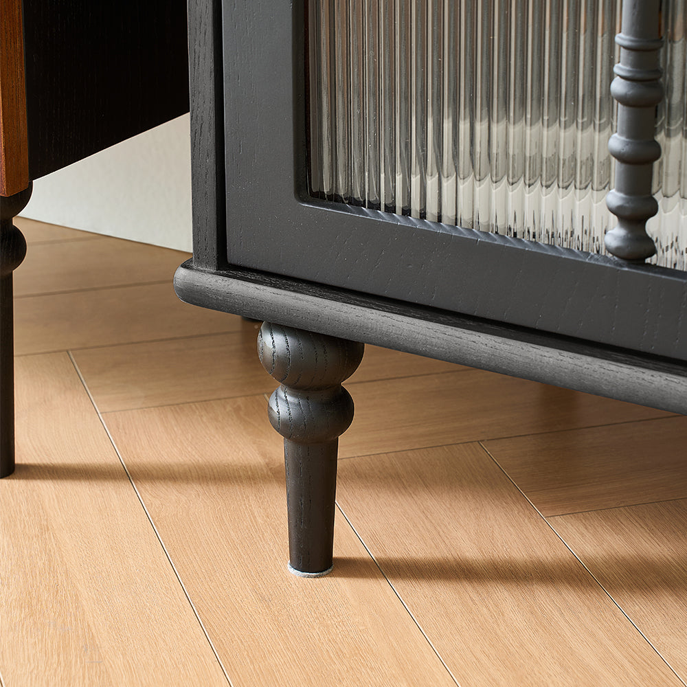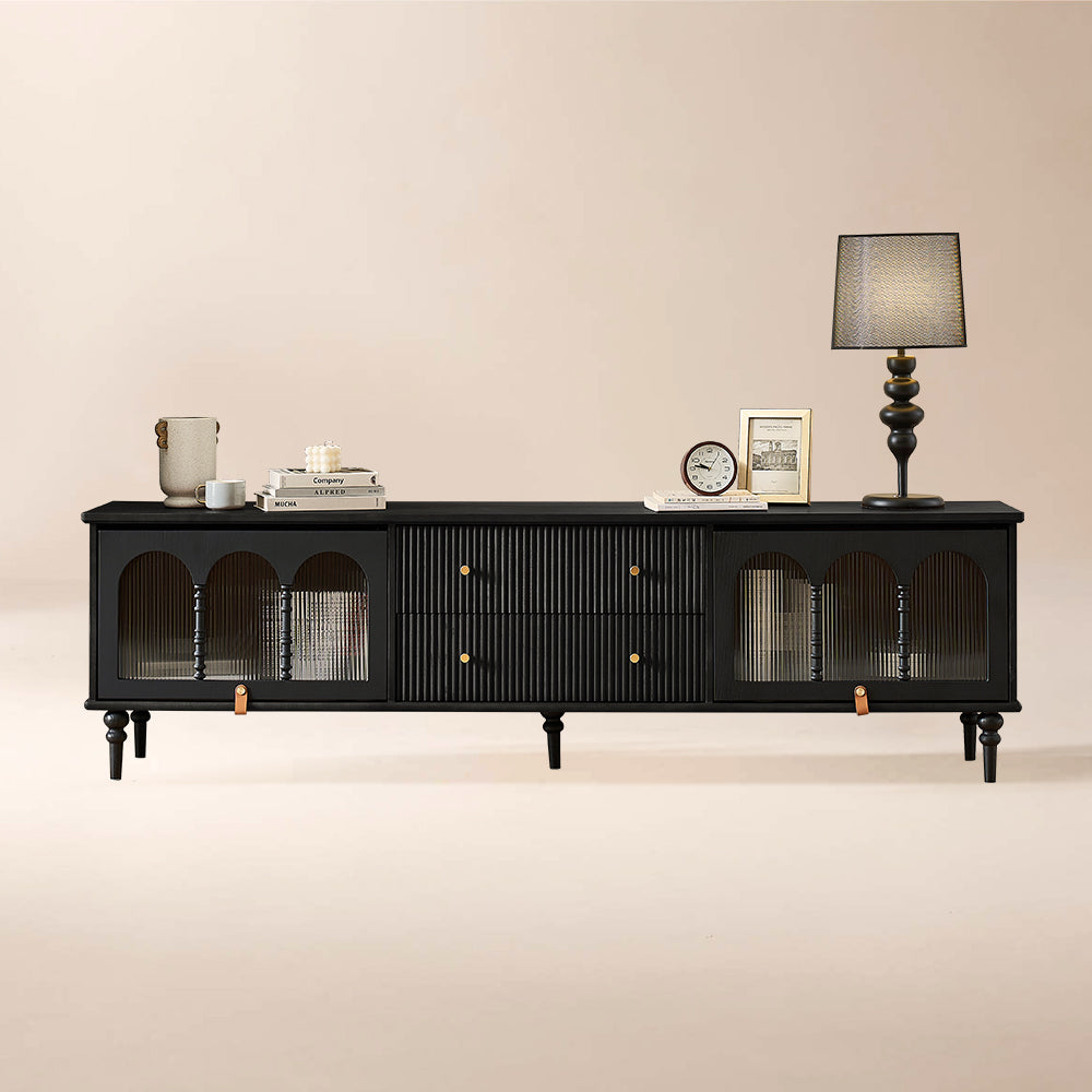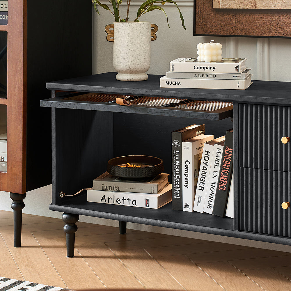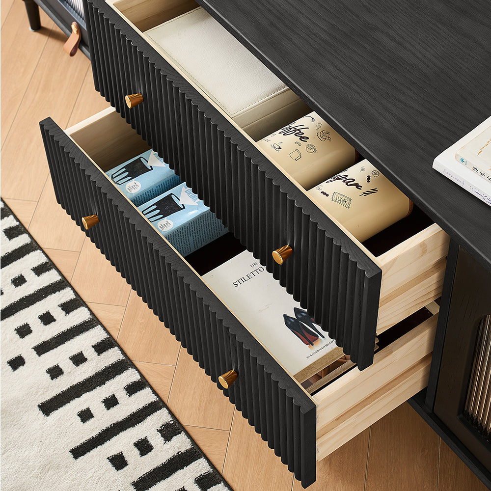 This Proist 70" Media Console features fluted design drawers in a black wood veneer that add a touch of organic texture to any space. Two flip doors open to reveal ample storage space with cable management cutouts to accommodate your media components and accessories, and two drawers provide additional storage needs. Constructed from refined solid wood, acrylic, and metal, it offers strong stability for long-lasting service.