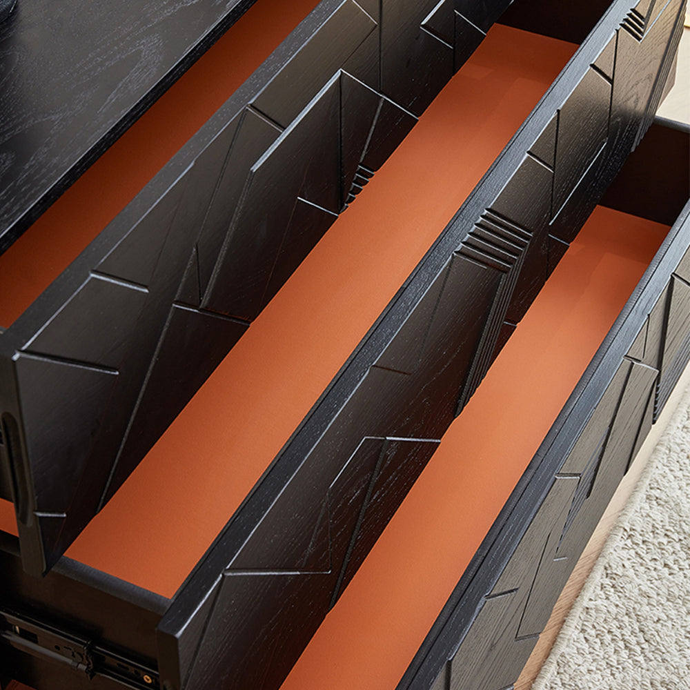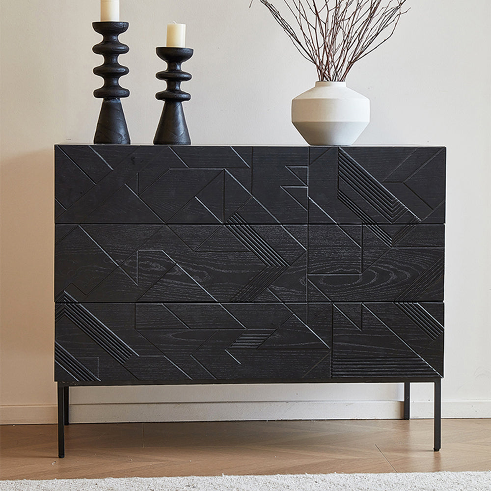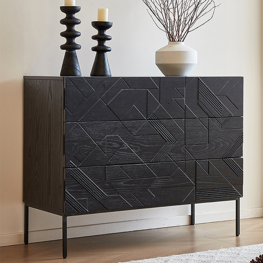 Our Vingo modern dresser chest has a unique geometric pattern design. The classic black color tone enhances the overall coordination and aesthetics of the space. The 3 large drawers provide an intuitive way to store and organize your belongings, keeping your space clutter-free. Made of high-quality laminate material with carbon steel legs, the chest has excellent stability and is suitable for a variety of interior decorating styles.
