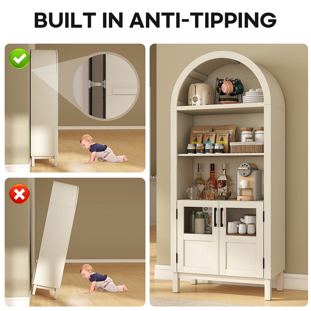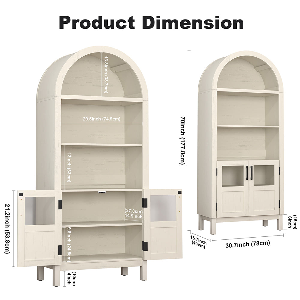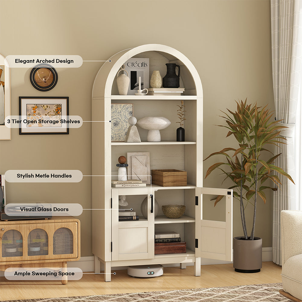 Wixio Arched Cabinet 70" Tall Cabinet with Glass Doors and Open Adjustable Shelves in White