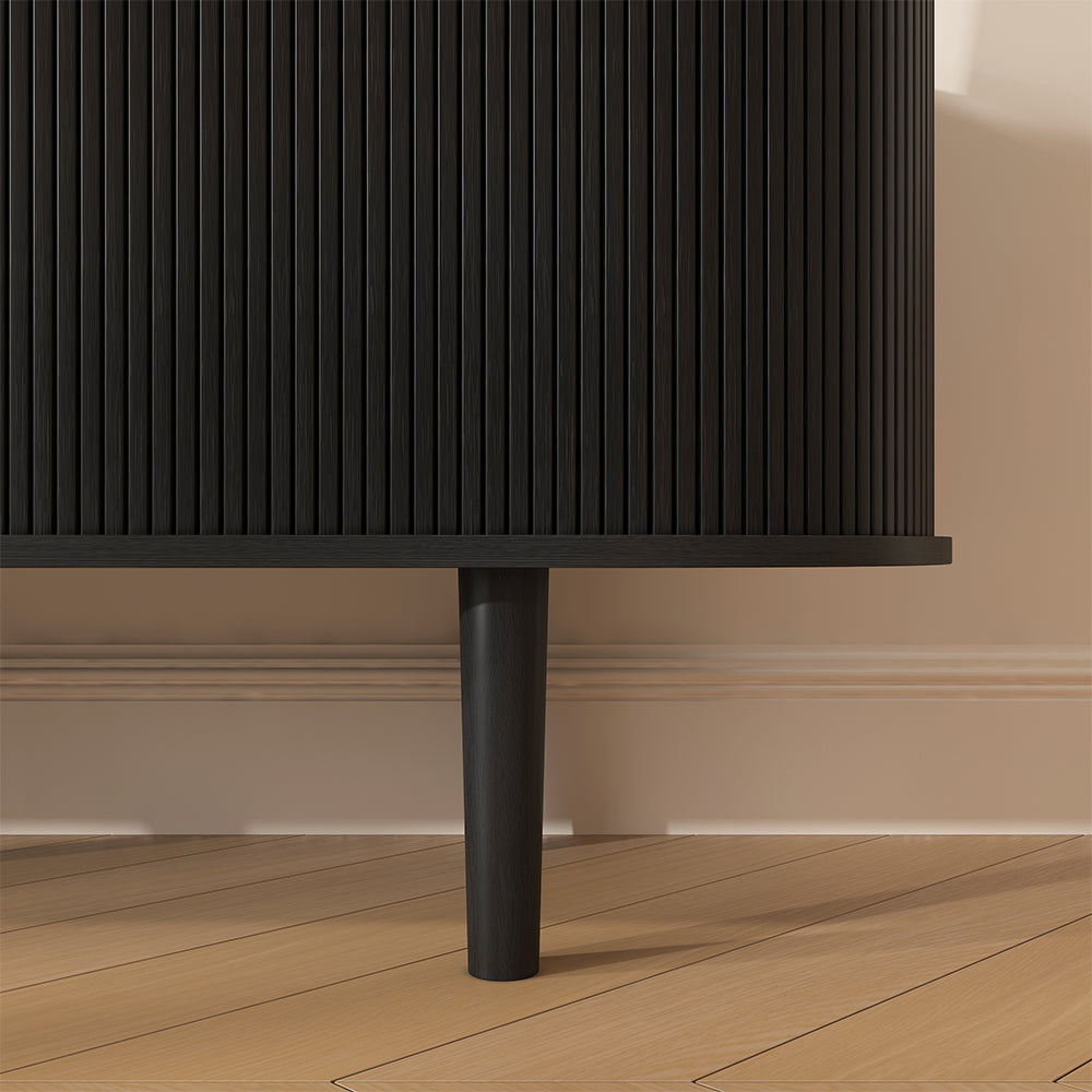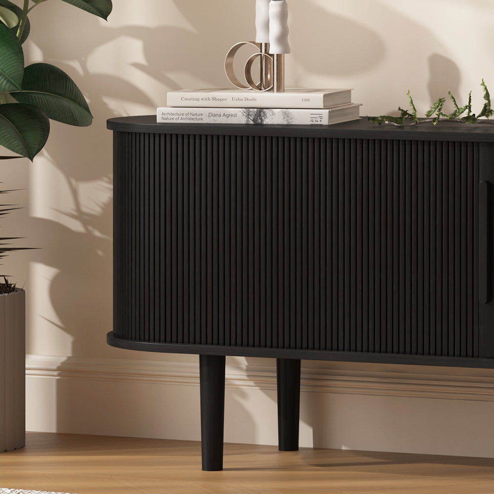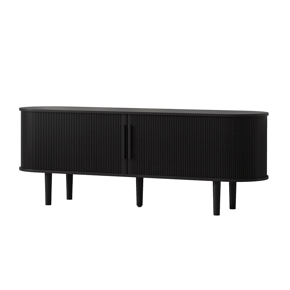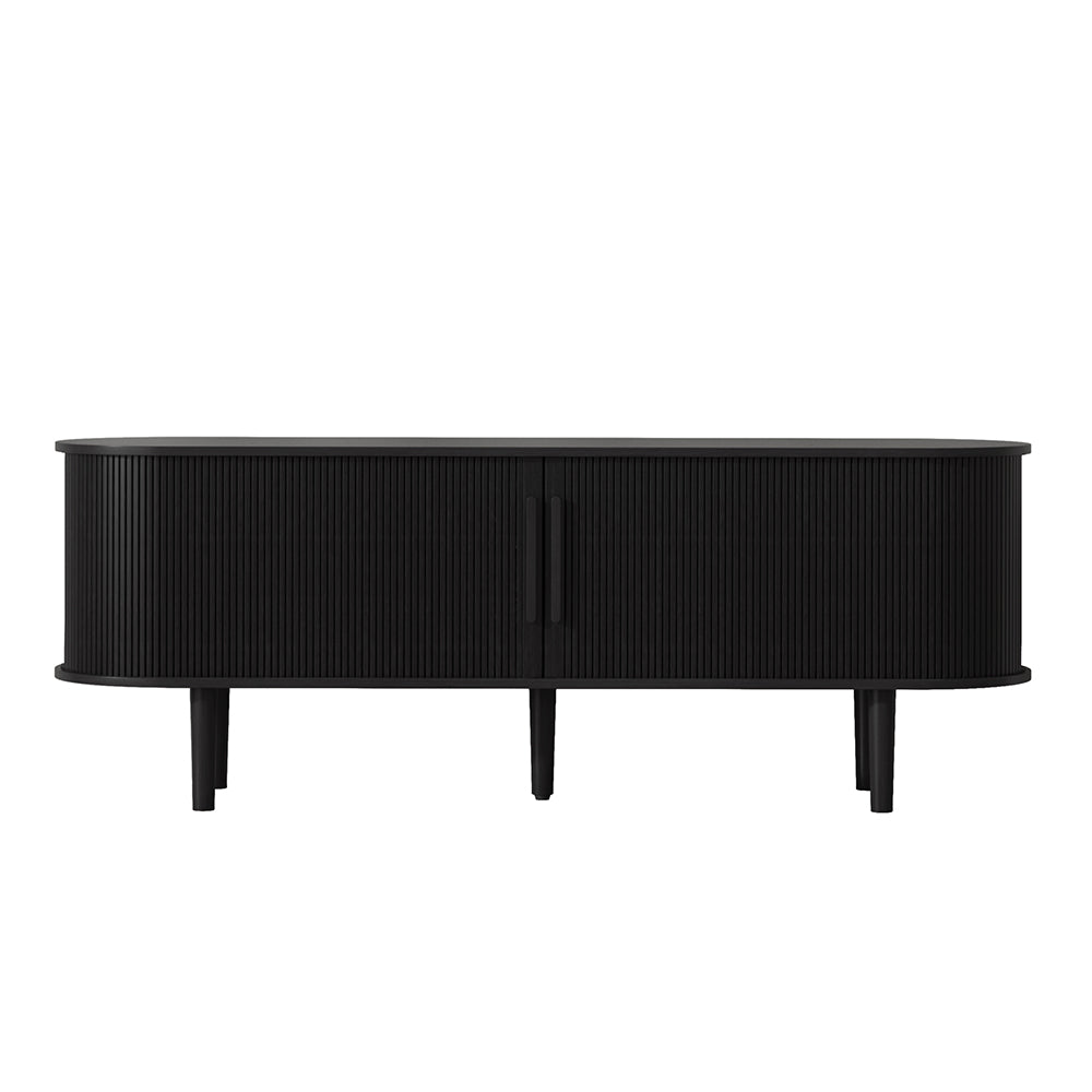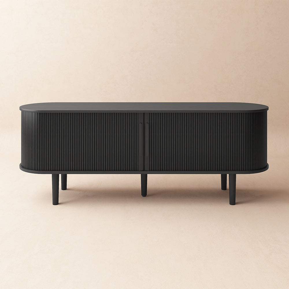 With its dynamic tambour doors, this Tille Collection offers an architectural aesthetic, adding character to any room. Two center doors slide to reveal a compartment with an adjustable shelf, accommodating a wide range of speakers or components. Constructed from refined MDF, melamine veneer, and rubber wood, this tv stand ensures everlasting beauty and an inviting look.