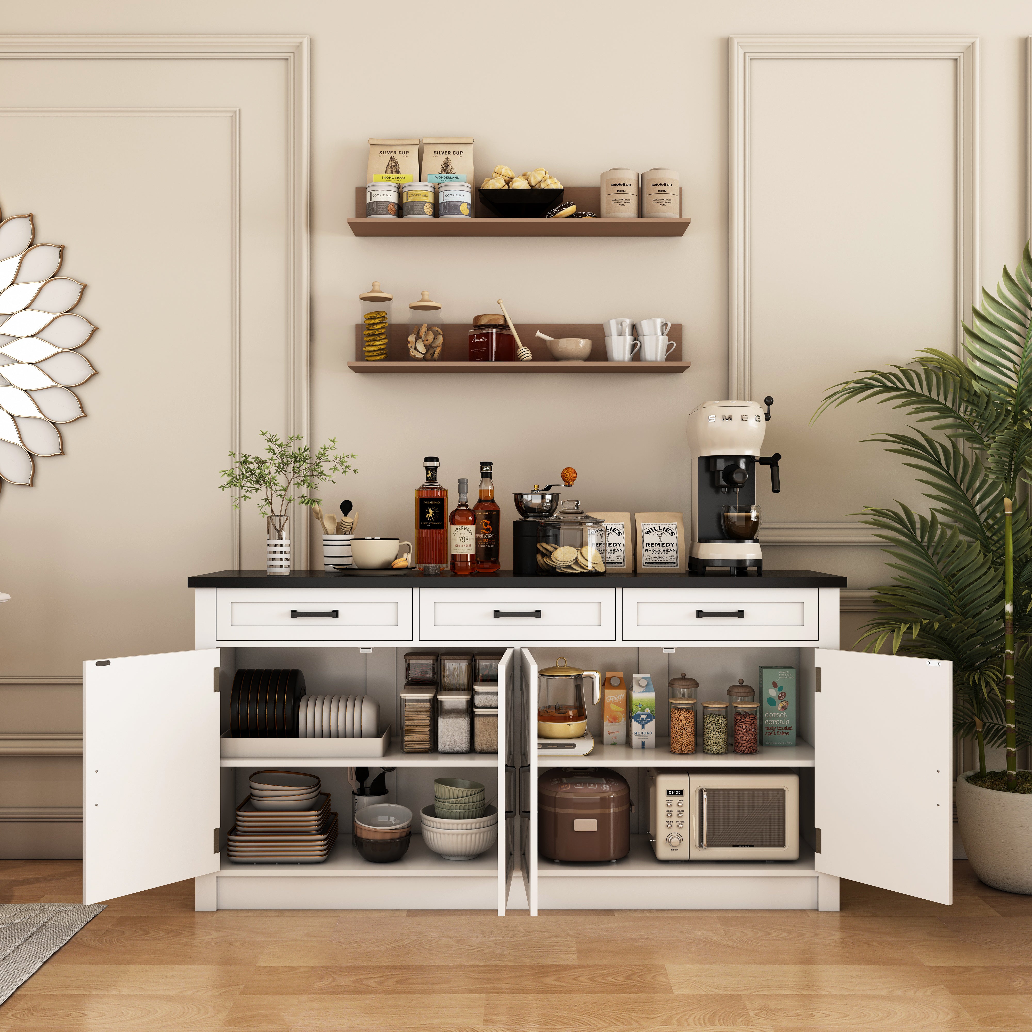 Our Wixio sideboard features clean lines and a classic black-and-white design. Made from durable MDF, it’s sturdy and resistant to warping, keeping its shape for years of use. Drawers and multiple shelves provide ample storage for everyday essentials, keeping your kitchen or living room organized and clutter-free. Perfect for living and dining areas, it blends seamlessly with modern, minimalist, and contemporary home styles.