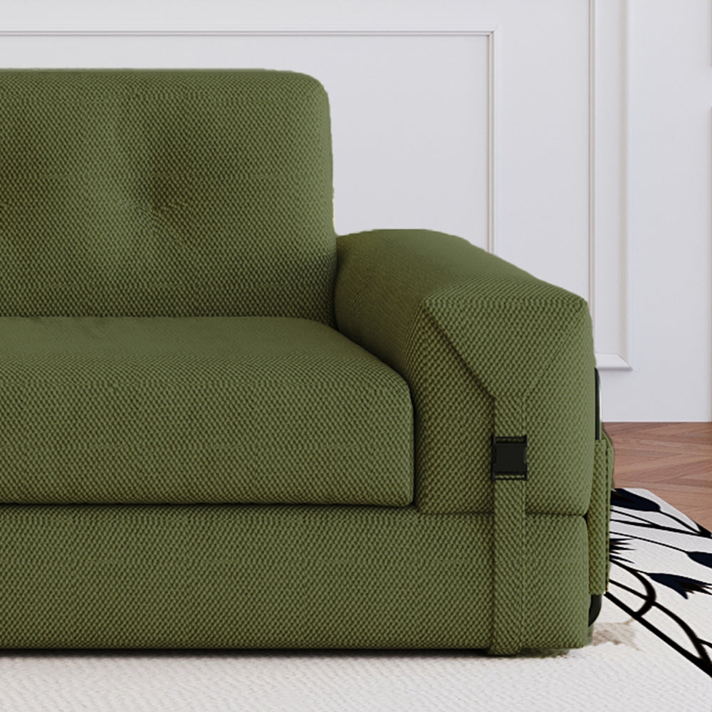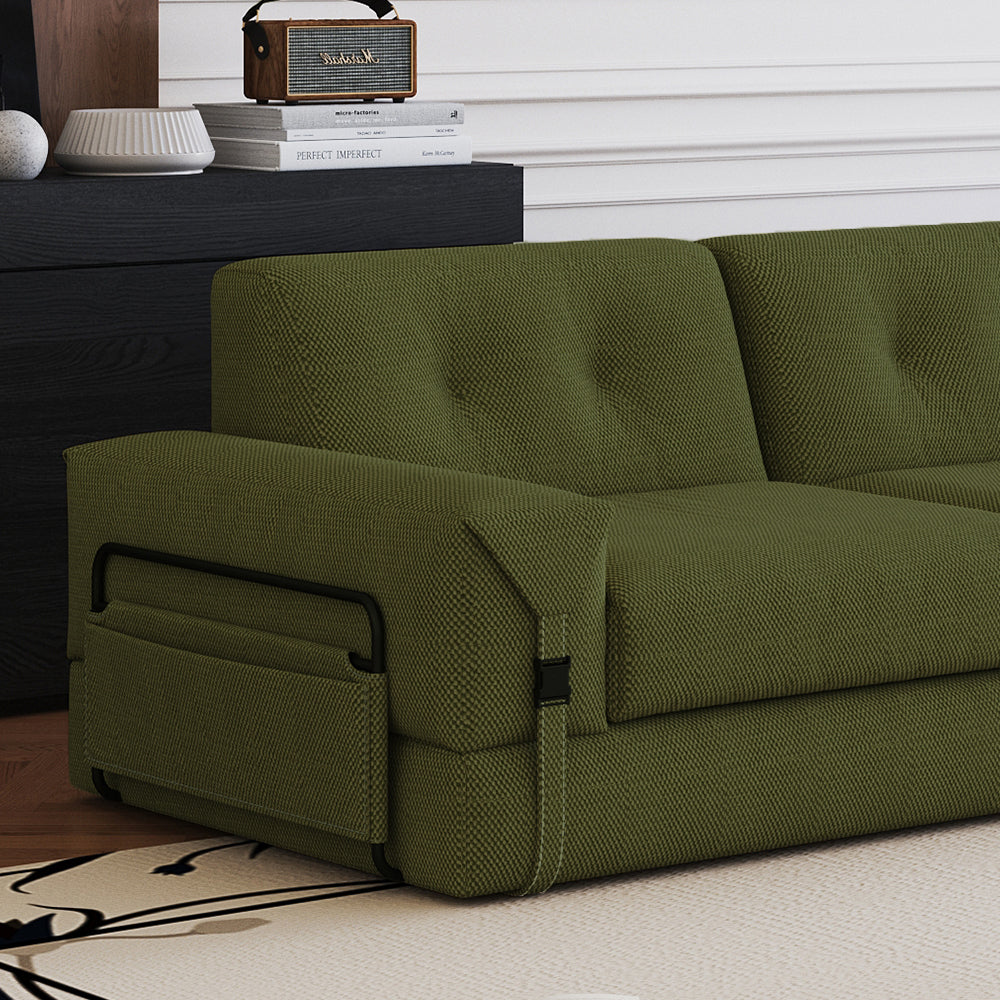 A fixed storage bag is at the side of the sofa for convenient storage of TV remote controls, mobile phones, books, etc.