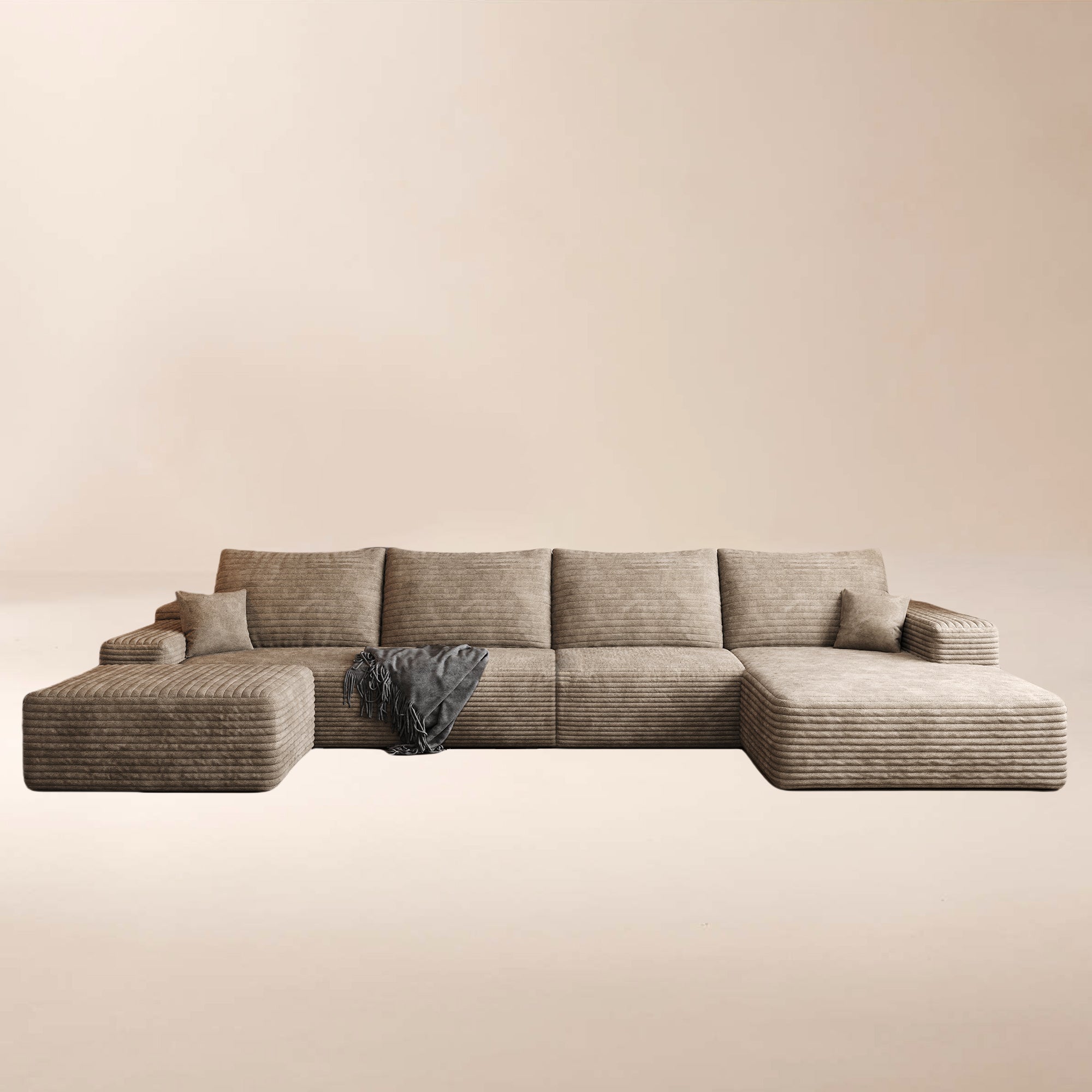 The Vada Sectional Sofa combines a modern style with aesthetic modelling. Immerse yourself in its rich texture, boasting a plush softness that invites you to unwind after a long day. Designed for durability, this sectional couch exudes sturdiness while maintaining its elegant allure.