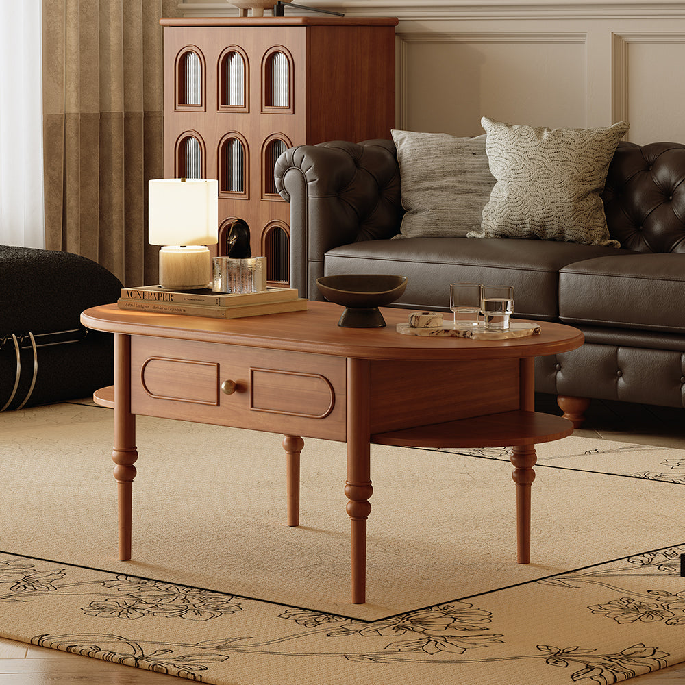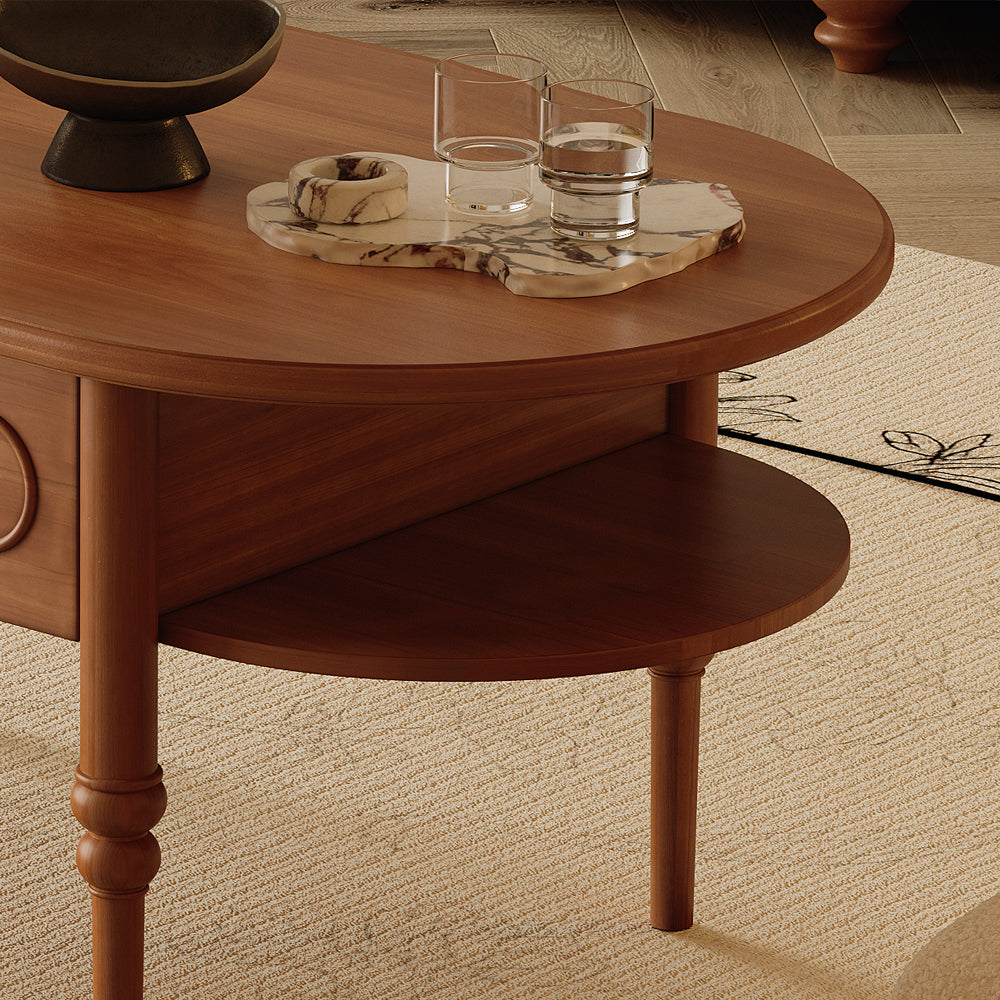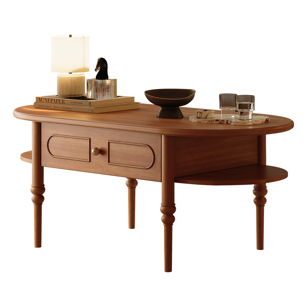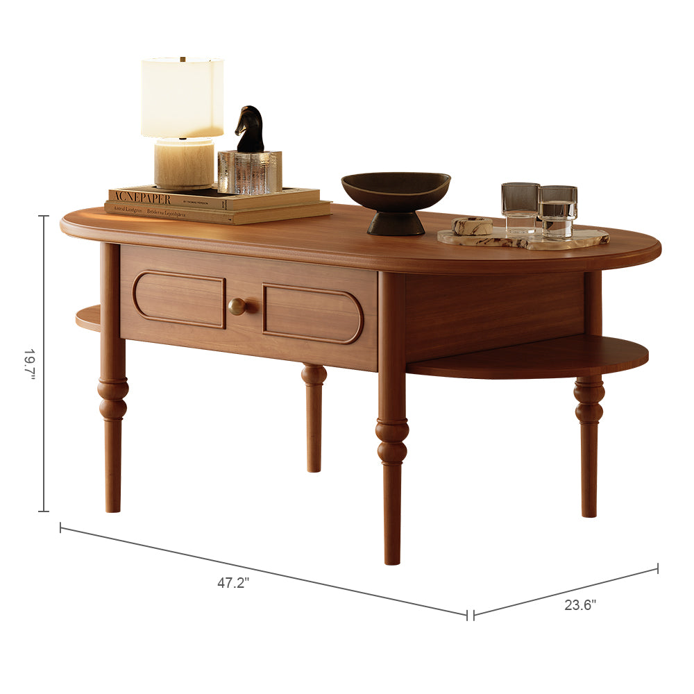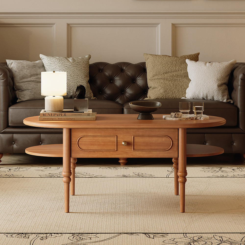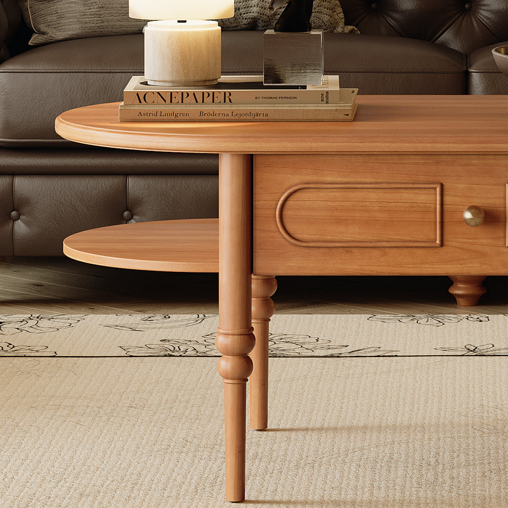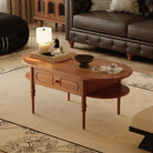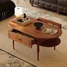 This Prenor Coffee Table brings a sense of refined grace to any space with its sleek lines and warm mid-century modern aesthetic. Its sleek oval shape complements any living space. Two drawers offer ample space for storing magazines, remote controls, toys, and more, while its semi-open storage design brings extreme practicality. Constructed from refined plywood, metal, and rubber wood legs, this coffee table ensures long-lasting service.