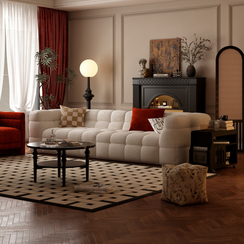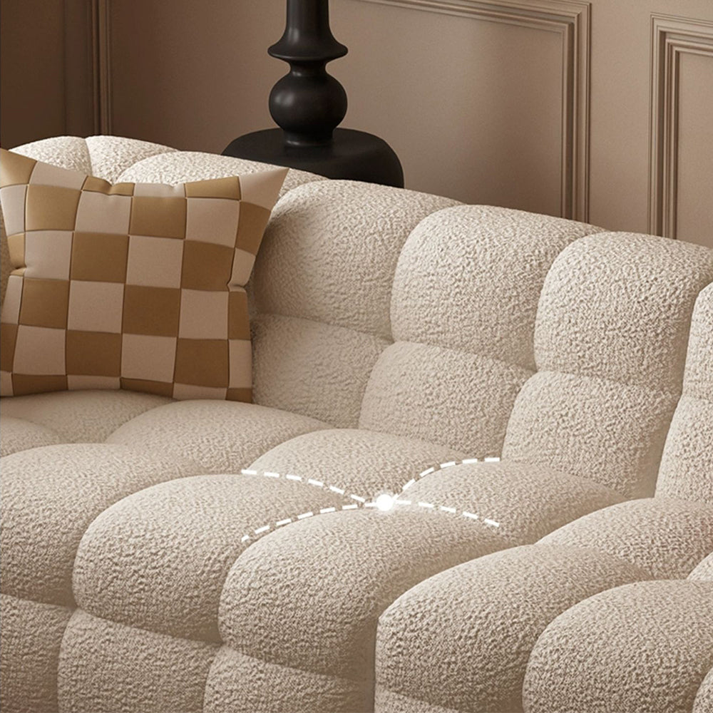 Our modern Comless sofa creates a warm and cozy atmosphere without losing the fashionable style. Classic channel tufting adds a touch of elegant texture to the home space. The material is made of soft and skin-friendly teddy fabric with high-resilience foam, giving you a comfortable sitting feeling.