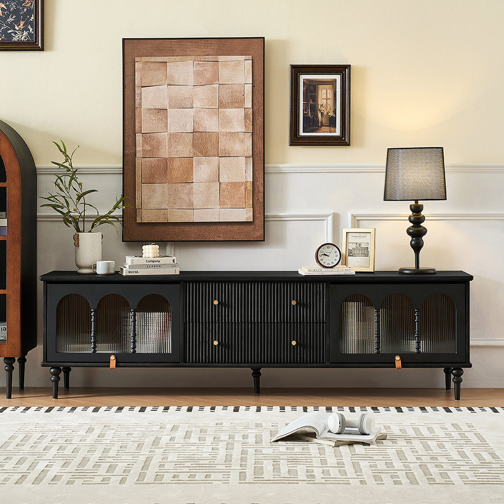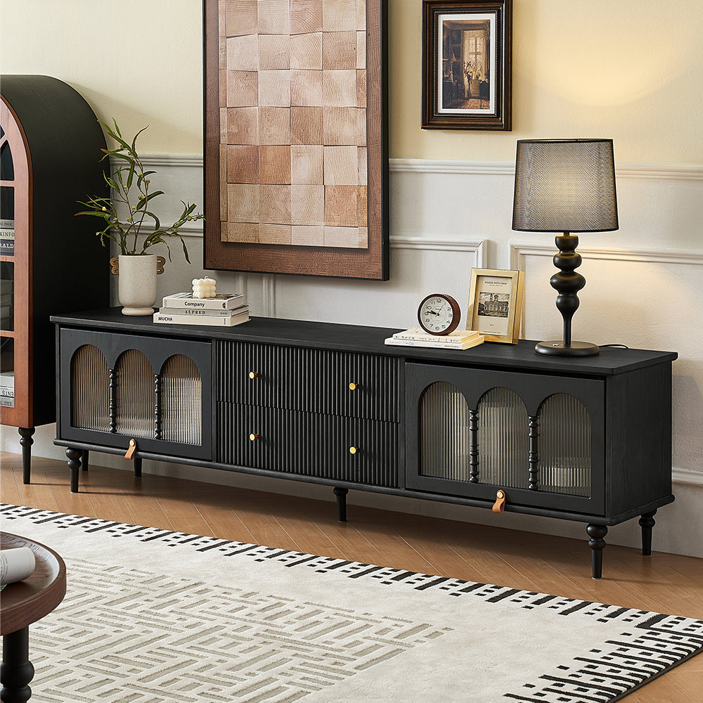 This Bined 70" Media Console features fluted design drawers and turning legs, adding a refined mid-century modern touch to your decor.