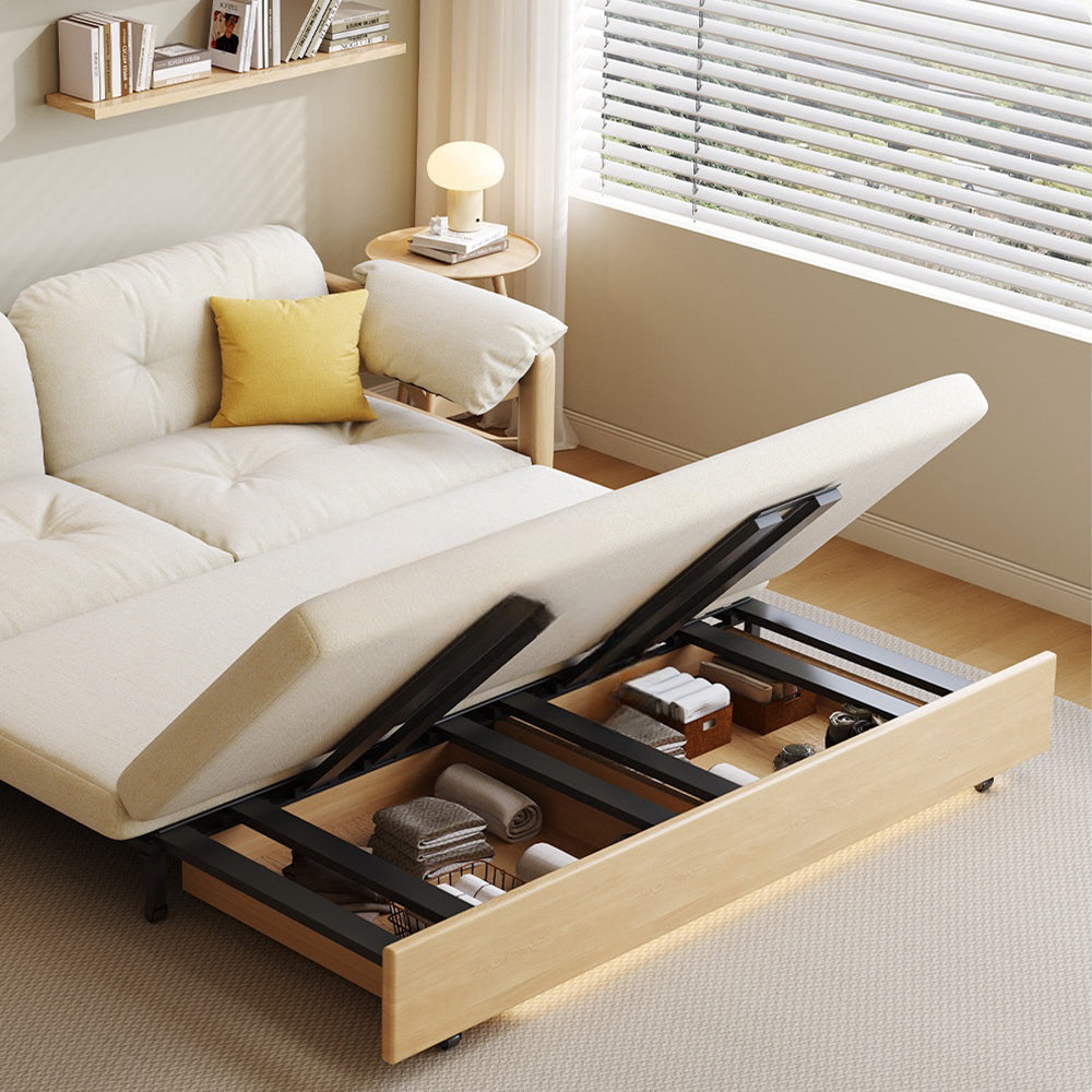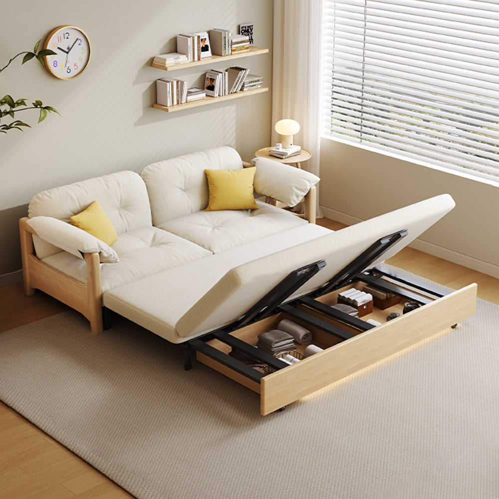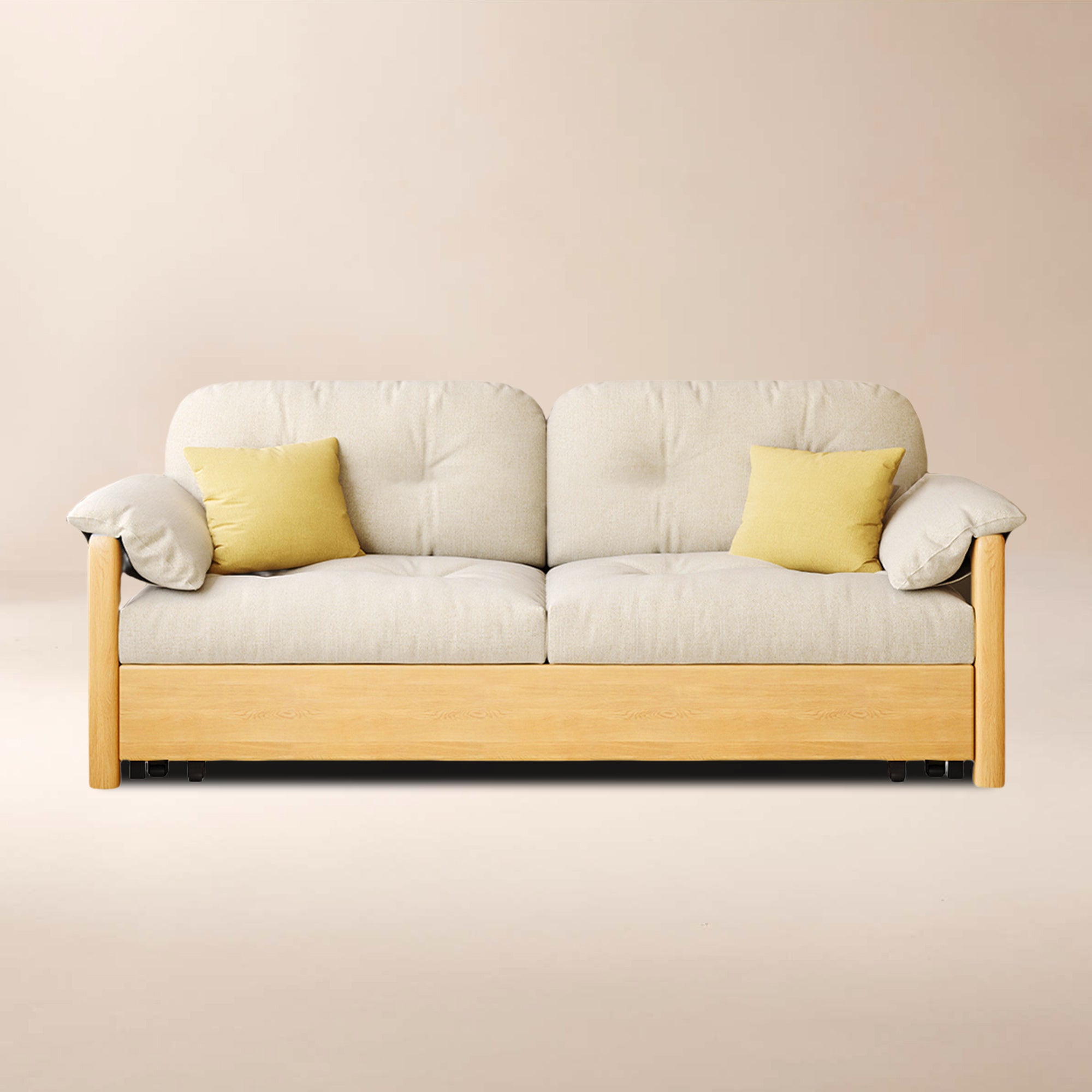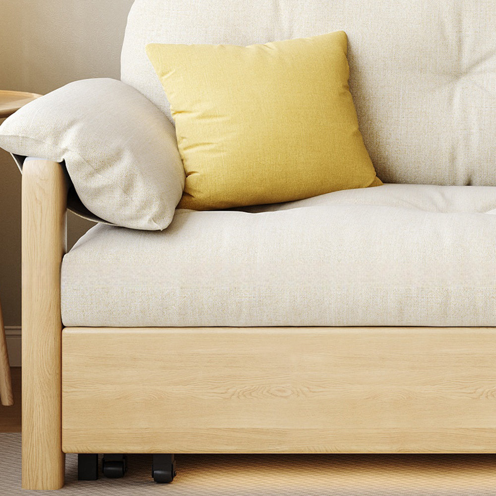 This 3-in-1 Chul Pull-Out Sofa Bed can be an inviting centerpiece that provides style and functionality in comfortable lounging. Featuring smooth casters, it effortlessly transforms from a lounge sofa to a twin-size sleeper bed with the added benefit of storage. It's upholstered in cotton linen with button-tufted details. A sturdy rubber wood base with a natural finish brings a sense of warmth and organic beauty to the design.