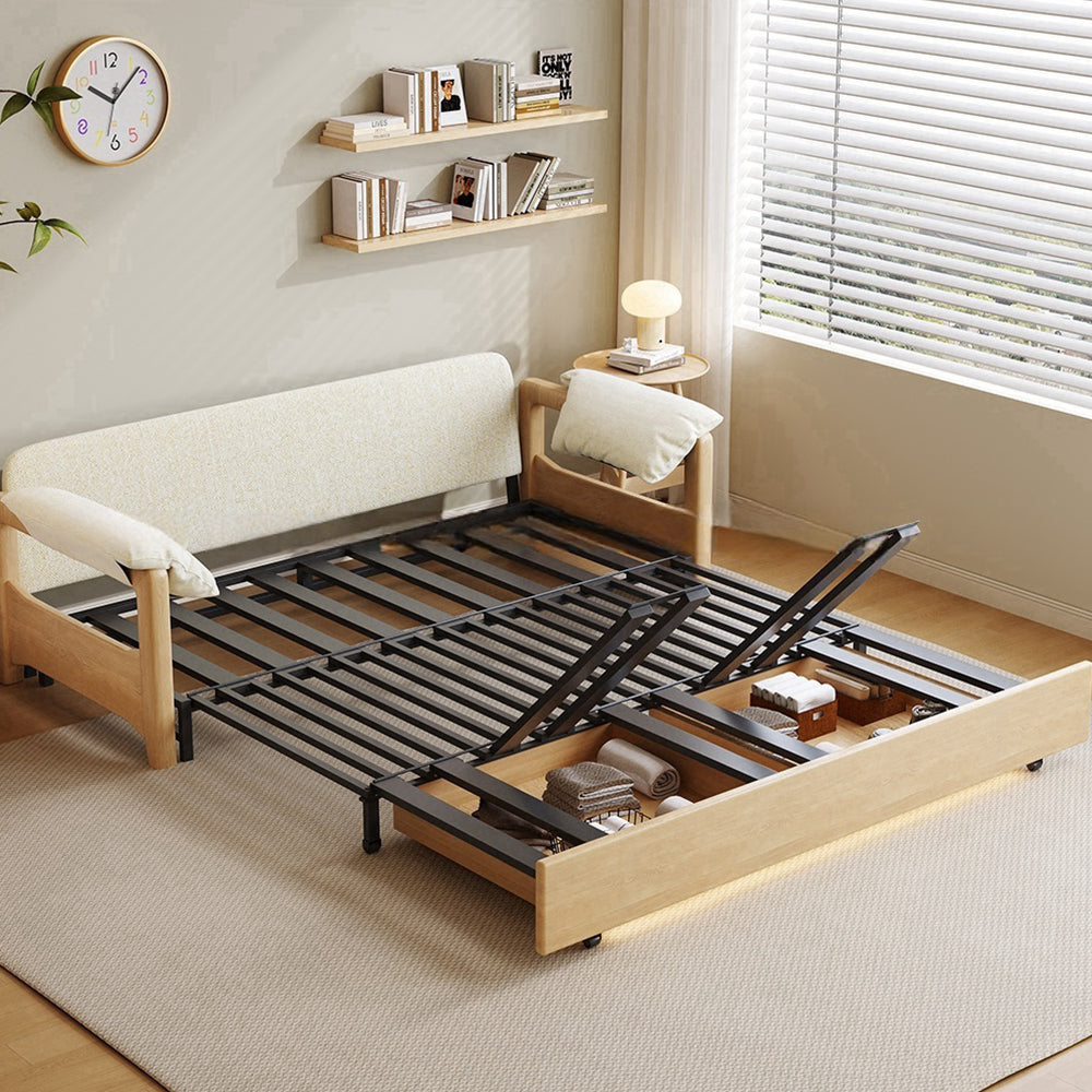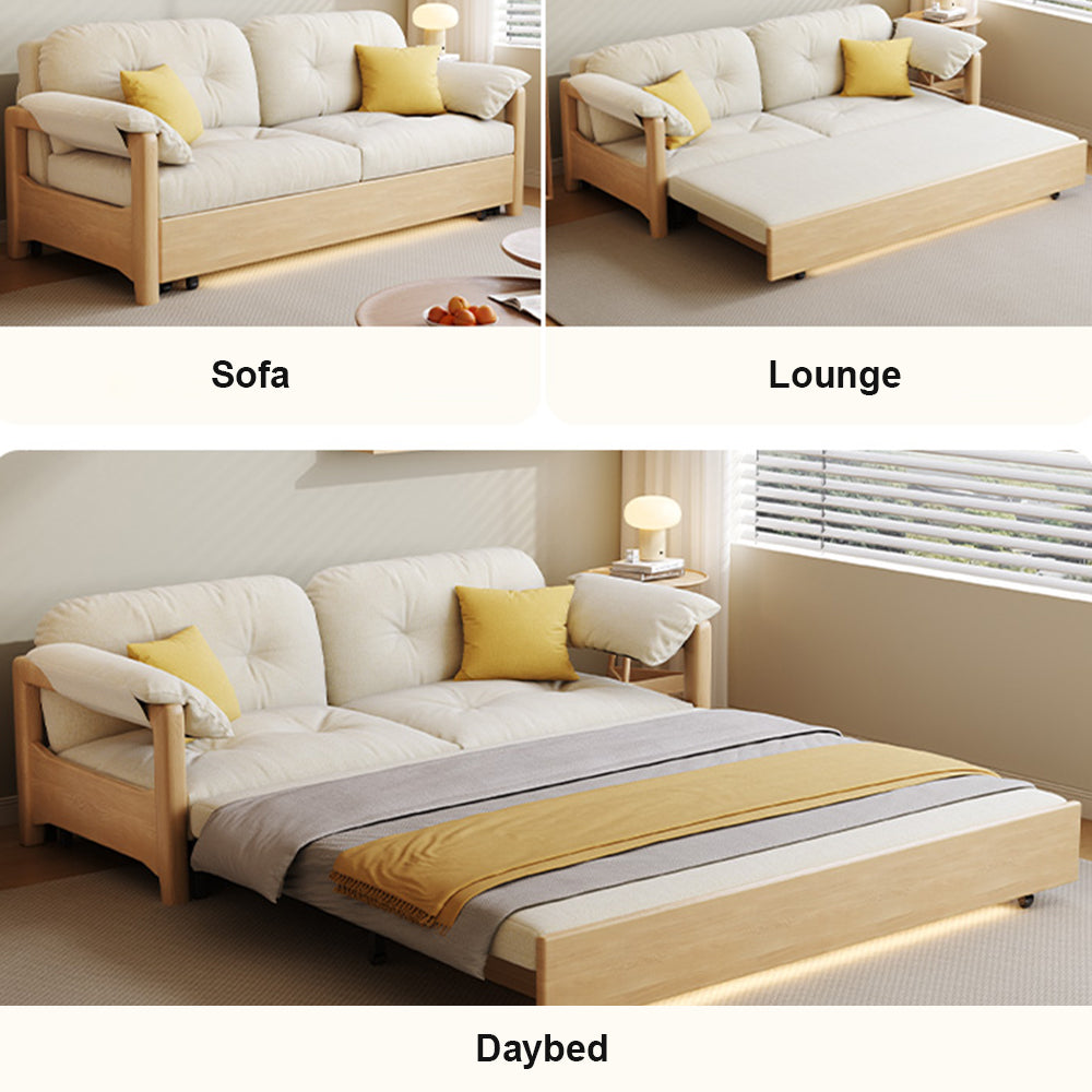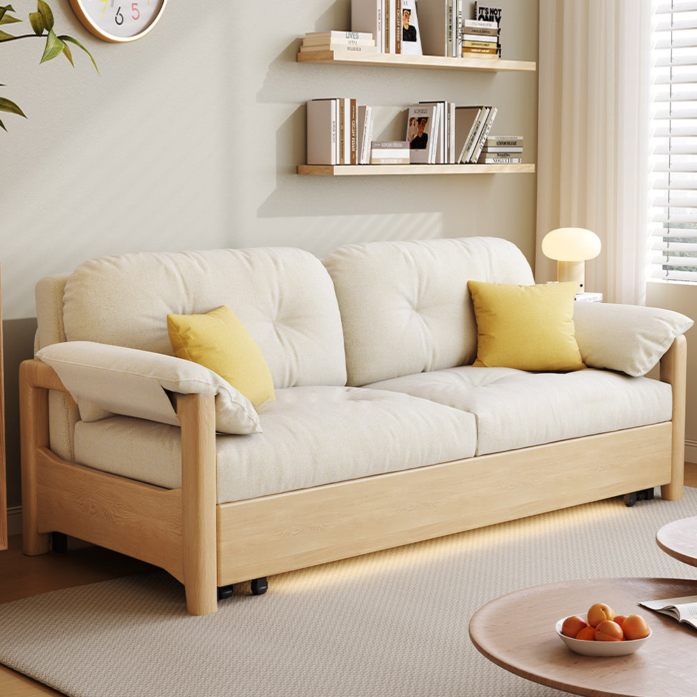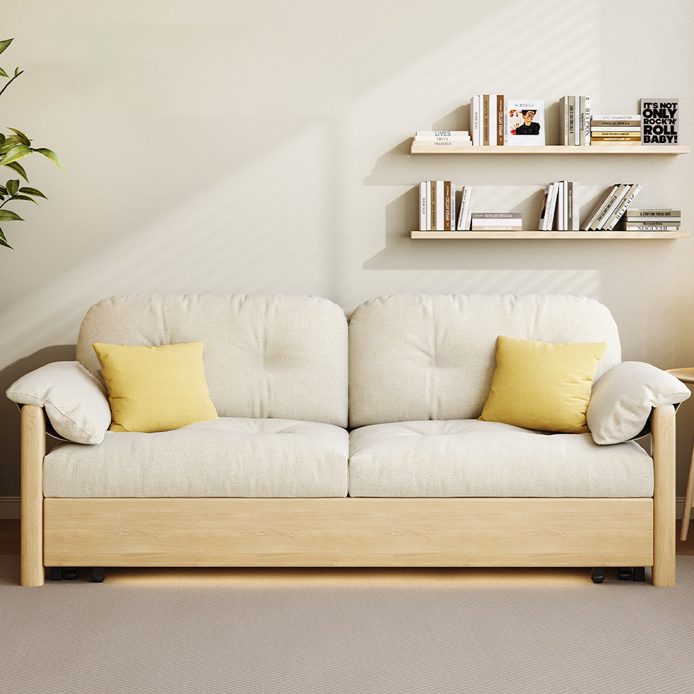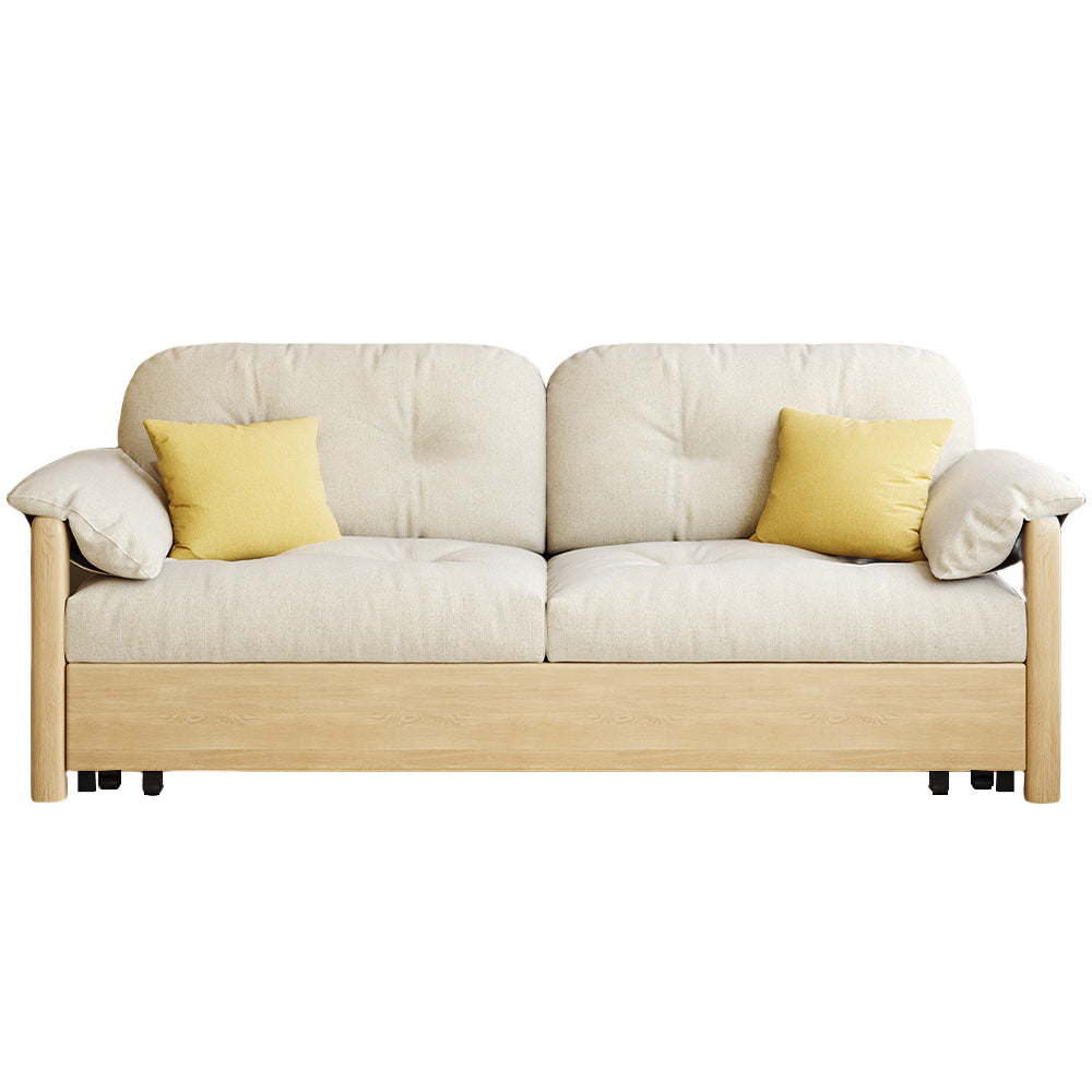 This 3-in-1 Chul Pull-Out Sofa Bed can be an inviting centerpiece that provides style and functionality in comfortable lounging. Featuring smooth casters, it effortlessly transforms from a lounge sofa to a twin-size sleeper bed with the added benefit of storage. It's upholstered in cotton linen with button-tufted details. A sturdy rubber wood base with a natural finish brings a sense of warmth and organic beauty to the design.